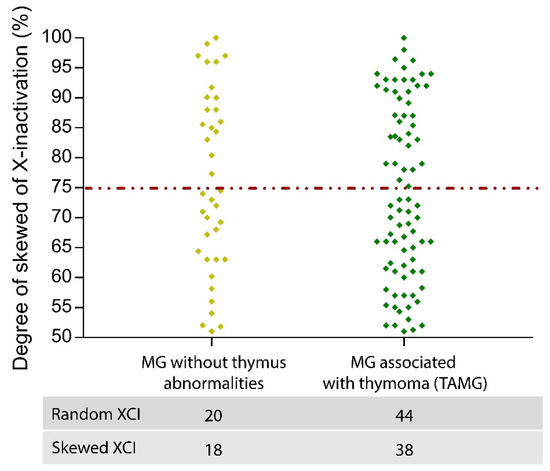 In this study, we hypothesized the contribution of a skewed XCI to the etiology of the disease and the female predisposition to MG. The preferential X mosaic condition was established in the peripheral blood of 121 MG and 130 healthy women using HUMARA assay.