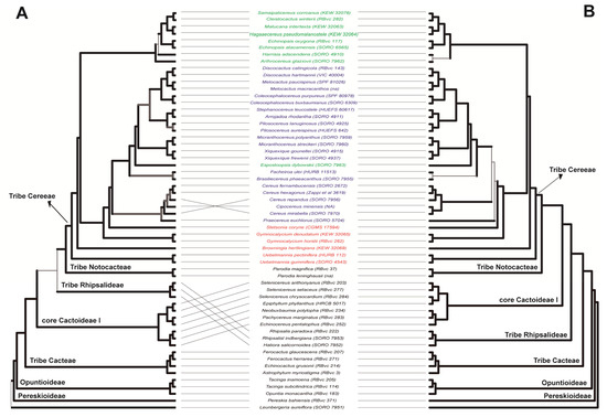 Molecular phylogenetics has been a fundamental approach to understand the systematics and diversification of major plant groups, such as in the family Cactaceae [1]. The use of a few traditional molecular markers (e.g., plastid DNA regions) has been the primary source for phylogenetic and dating inference in Cactaceae [2]. However, the evolutionary relationship within tribes and genera remains largely inconclusive, partly due to the lack of phylogenetic signals in these molecular markers (see References [3,4,5,6,7] for examples). The poor phylogenetic resolution within Cactaceae is likely a reflection of the recent and rapid diversification experienced by the family since the late Miocene [8]. This tempo and mode of diversification may generate complex patterns of gene divergence, including large-scale incomplete lineage sorting (deep coalescence; see Reference [9]). Moreover, the reticulate evolution events experienced for some clades may also obscure the phylogenetic signals in recent radiation groups [10]. Accessing multiple independent loci allied to phylogenetic approaches that allow for gene tree heterogeneity [11] may be a better strategy to resolve challenging groups and recover highly supported phylogenies within this family.