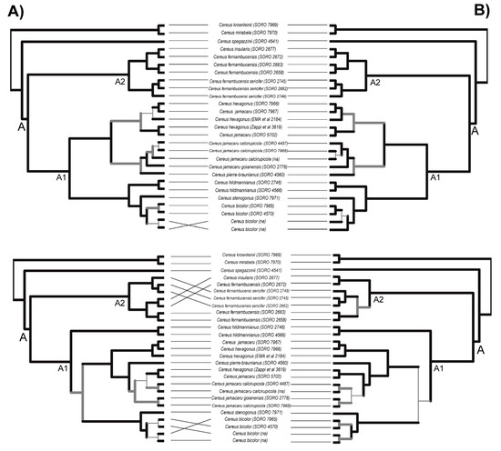 The phylogenetic backbone for Cereus clade A recovered the same relationships estimated for this clade by using RAD-Seq data with high branch support (Figure 2; see Reference [17]). Furthermore, all conspecific samples nested together, with the exception of the representatives of C. hexagonus and C. jamacaru (Figure 2). The hypothesis of a peripatric origin of C. insularis from coastal populations of C. fernambucensis subsp. fernambucensis in Northeastern Brazil [51,65] was corroborated with all sub-datasets and phylogenetics methods. Only the ML tree inferred with the Cereus-all sub-dataset provided a slightly different relationship among these taxa, nesting C. fernambucensis subsp. sericifer within the clade of C. fernambucensis subsp. fernambucensis.