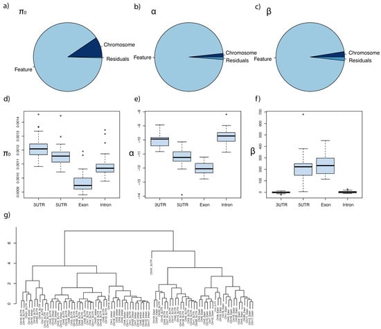 Effect of long-term evolutionary rates and recombination on shaping genetic diversity. π0 represents the level of the intrinsic genetic diversity. Selection on a genomic locus reduces the genetic diversity at the locus. Hitchhiking propagates the effect of selection on the surrounding region. We described the selective effect () on a gene in terms of the long-term molecular evolutionary rate () as (see Materials and Methods). Parameter α describes the impact of recombination relative to long-term rate in the model. Higher α values in genomic regions indicate that recombination contributed more to the prediction of genetic diversity than the regions with lower α values. β describes the impact of the long-term rates of nearby genes. Higher β values in genomic regions indicate that the long-term rates of genes contributed more to genetic diversity than the regions with lower β values. The three parameters were estimated for each chromosome and for each feature (3′-UTR, 5′-UTR, exon, or intron). In total, we obtained 88 (22 chromosomes 4 features) estimates each for π0, α, and β. (a–c). Pie charts for π0, α, and β, respectively, representing the contributions of chromosome, feature, and residuals. The variances of π0, α, and β were decomposed into among-chromosome variances, among-feature variances, and variances of residuals in two-way ANOVA that represented the interactions of each set of factors. (d–f). The among-chromosome variations of π0, α, and β, respectively, for each feature (3′-UTR, 5′-UTR, exon, or intron). (g). Hierarchical clustering of π0, α, and β for each chromosome and feature. We normalized the values of π0, α, and β to analyze the three parameters together.