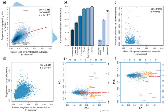 Bridging micro- and macroevolution at the molecular level: (a). Correlation between the human proportion of segregating sites (q) and the rate of mammalian molecular evolution (r) of 14,671 genes. cor* indicates the bias-corrected correlation. (b). Correlation between the human proportion of segregating sites (q) and the rate of molecular evolution (r) based on gene trees of different taxonomic clades. (c). Correlation between the proportion of human de novo mutations and the rate of mammalian molecular evolution (r). (d). Correlation between the proportion of human singletons and the rate of mammalian molecular evolution (r). (e,f). Principal component analysis (PCA) of q of five species and the long-term rate using 5560 single-copy genes.