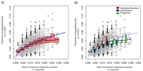 To test the above hypothesis that molecular evolutionary rates affect intraspecific genetic diversity, we analyzed and compared the genetic diversity of humans with the mammalian molecular evolutionary rates of each gene and focused on protein-coding regions. The proportion of segregating sites (q) is the most direct estimate of human intraspecific genetic diversity. Nucleotide diversity (π), the mean pairwise distance among sequences, more heavily weights older mutations. Singletons are rare variants that are only observed once in a sample, and can be considered as the collection of recent mutations. The allele frequency of singletons in autosomes is 1/5008, which is less than 0.02% of the number of sites in 2504 humans included in the 1000 Genomes Project data [16,17,18]. De novo mutations are obtained by comparing genomes of direct offspring with those of their parents, with the differences uncovered being the closest reflection of germ cell mutations [19]. By comparing the effects of molecular evolutionary rates on these different indices, we may gain some sense of the longevity of deleterious or slightly deleterious mutations that have been selected against [10].