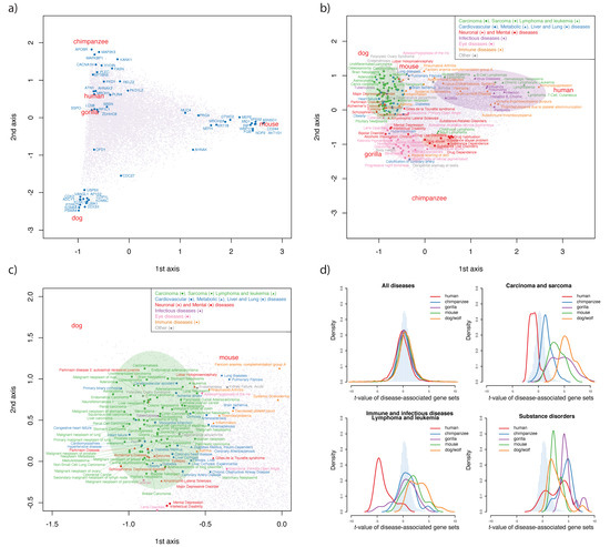 The prominent diseases detected for mice and dogs/wolves were largely cancer diseases with positive t-value (Figure 4d; Table S4). The “cancer and organ diseases” group was also located near mice and dogs/wolves in CA (Figure 4b–c). These results indicate that organ development was the most significant character that differentiated mice and dogs/wolves from great apes.