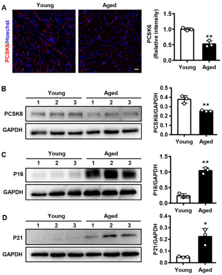 Based on the microarray data of decreased Pcsk6 mRNA levels in aged rats [26], we examined PCSK6 protein expression in a natural aging mouse model using immunofluorescent staining and Western blotting. We found that PCSK6 protein expression was reduced in hearts of aged mice (24 months) compared to those of young mice (3 months) (Figure 1A,B). Moreover, protein levels of senescence markers P16 and P21 were higher in hearts of aged mice than those of young mice (Figure 1C,D). The results indicate that PCSK6 expression decreases with age.