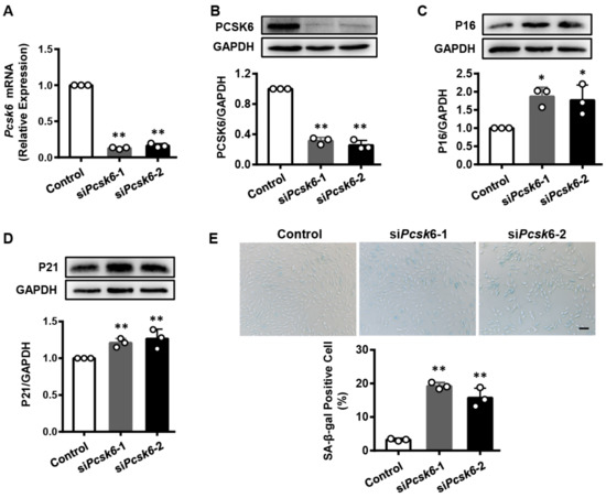 Decreased PCSK6 expression in senescent cardiomyocytes induced by D-gal. (A) SA-β-gal staining for H9c2 cells with D-gal treatment. Scale bar: 100 µm. Percentages of blue-stained cells were calculated. (B,C) P16 and P21 protein levels in D-gal-treated H9c2 cells were estimated by densitometric quantification of Western blots. (D) Il6 mRNA expression in H9c2 cells treated with D-gal by qPCR. (E) Western blot analysis of PCSK6 protein expression in H9c2 cells in the presence of D-gal. Values are mean ± S.D. * p < 0.05, ** p < 0.01 vs. Control.