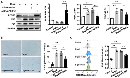 To verify the effect of PCSK6 on cardiomyocyte senescence, we overexpressed PCSK6 in senescent H9c2 cells induced by D-gal. The cells were treated with D-gal and transfected with a PCSK6 expression plasmid. We found that P16 and P21 protein expression levels decreased in D-gal-treated H9c2 cells that were transfected with the PCSK6 expressing plasmid as compared to those in vector-transfected control cells (Figure 5A). The percentage of SA-β-gal positive cells was lower in D-gal-treated cells with PCSK6 plasmid transfection than in vector-transfected control cells (Figure 5B). Furthermore, ROS levels were also lower in D-gal-treated H9c2 cells with PCSK6 transfection (Figure 5C). These results show that PCSK6 overexpression rescues senescence and dysfunction induced by D-gal in cultured H9c2 cells.