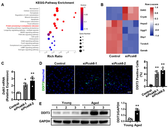 Identification of DEGs by pathway analysis in H9c2 cells with Pcsk6 knockdown. (A) KEGG enrichment analysis of DEGs in signaling pathways. Y-axis denotes pathway and X-axis denotes rich ratio. The 20 most significantly changed pathways are shown. The targeted pathway in the study is highlighted with red color. The color intensity and size of bubbles indicate Q value and number of genes, respectively. (B) A heat map for DEGs in siPcsk6-transfected H9c2 cells. The 7 most significant DEGs in the protein processing in the ER pathway. Red and blue colors represent up- and down-regulated genes, respectively. (C) qPCR analysis of Ddit3 mRNA expression in siPcsk6-transfected H9c2 cells. (D) Immunofluorescent staining for DDIT3 (green) and nuclei (blue) in siPcsk6-transfected H9c2 cells. Scale bar: 40 µm. Percentages of DDIT3 positive cells were calculated. Data are mean ± S.D. * p < 0.05, ** p < 0.01 vs. Control. (E) DDIT3 protein levels in hearts from young (3 months, n = 3) and aged (24 months, n = 3) mice were assessed by densitometric quantification of Western blots. Values are mean ± S.D. * p < 0.05, ** p < 0.01 vs. Young.