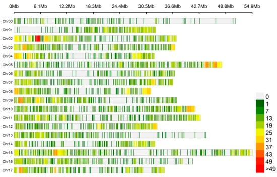 In total, 6495 circRNAs were identified at five tissues of ‘Gala’ apple, and 5163 circRNAs were distributed in the 17 chromosomes. It revealed a non-random distribution of circRNAs in the chromosomes. Some chromosomal regions lacked circRNAs, and some regions had a high density of circRNAs (Figure 1). In total, 517 and 272 circRNAs were from chromosome 15 and chromosome 14, which accounted for the most and the least (8.0% and 4.2%, respectively); the numbers of circRNAs in other chromosomes ranged from 287 to 483 (Table S4).