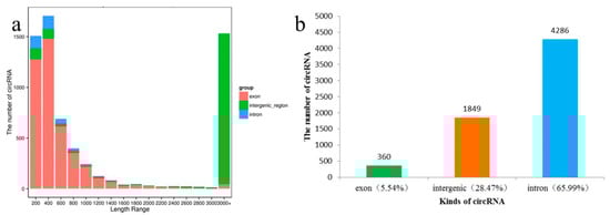 Screening and classification of circRNAs: (a) Length distribution of circRNAs identified; (b) Number of different kinds of circRANs identified.