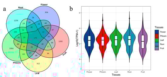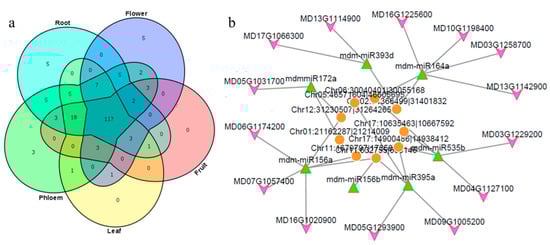 Furthermore, miRNAs also have the characteristics of spatial-temporal expression; interactions between circRNAs and miRNAs were featured to illustrate the function in different tissues. There were 163 interactions in all five tissues between 18 miRNA families and 38 circRNAs, including mdm-miR1511, mdm-miR156, mdm-miR162, and mdmmiR164 and so on; most interactions were with circRNAs and mdm-miR156. There were 431, 414, 214, 290, and 301 interactions only in roots, phloem, leaves, flowers and fruits, respectively (Table S11). Possible specific and common miRNAs were analyzed in five tissues; the Venn diagram showed that there were 117 miRNAs that could be targets in all tissues, 3 miRNAs in phloem and 5 miRNAs in flowers and roots (Figure 6a; Table S12). In particular, mdm-miR160 families only had interactions in flowers, mdm-miR168 families and mdm-miR394 families in roots; they may have special expression and regulation characteristics among different tissues.