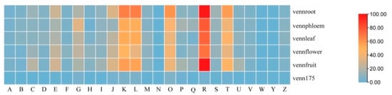 Cluster of genes (COG) classifications of parent genes (protein-based genes) of tissue specific and prevalence expression of circRNAs. (The capital letters represent the function classification of COG, as Figure 4; venn175 represented prevalence expression in all five tissues, vennroot, vennphloem, vennleaf, vennflower and vennfruit representing only the expression in root, phloem, leaf, flower and fruit, respectively.)