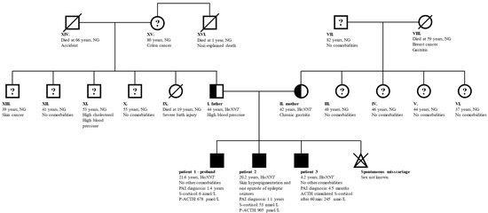 General characteristics of family members. Full symbols indicate patients with confirmed PAI, half-filled symbols confirmed carriers of pathogenic NNT variant, and “?” family members without PAI, but no information on carrier status. Family member indexes, age at last follow-up, relevant comorbidities, genetic status, the age at diagnosis of PAI, and laboratory results indicative of PAI are written. Patients 1 and 2 presented with an acute adrenal crisis and as probands drove the early identification of PAI in patient 3. Children of members III–VI and IX–XIII were not affected and are therefore excluded from the genogram. Member XVI died at the age of 1 year from an unidentified cause. Abbreviations: ACTH—corticotropin; He/HoNNT—heterozygous/homozygous for NM_182977:c.1575dupA in NNT; NG—genetic testing for NNT variant not performed; NNT—gene for nicotinamide nucleotide transhydrogenase; P—plasma; PAI—primary adrenal insufficiency; S—serum.
