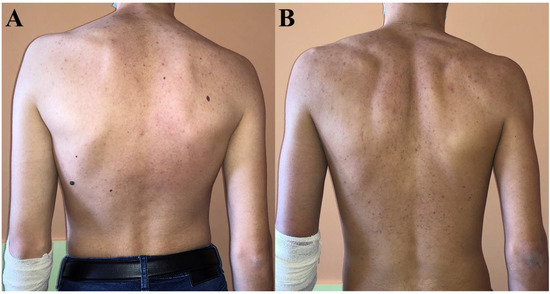 Skin coloration at last visit in patient 1 (A) and patient 2 (B). Patient 2 was significantly more hyperpigmented—particularly around elbows—than patient 1 who had the same skin tone as their parents and patient 3.