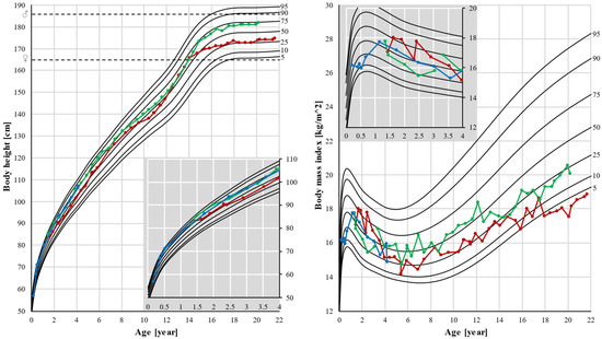 Body height and body mass index (BMI). Pubertal growth spurt was earlier in patient 1, and also growth stopped earlier in this patient, resulting in a lower final height. Black lines represent the 5th, 10th, 25th, 50th, 75th, 90th, and 95th percentiles. Dots represent individual measurements: red for patient 1, green for patient 2, and blue for patient 3. Dashed lines represent final heights of the father (♂) and mother (♀). In the corner, there is a magnified part of the graph up to age 4.