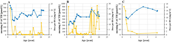 At the time of PAI diagnosis, all three patients had been started on a glucocorticoid supplementation with oral hydrocortisone, which was followed by a significant decrease in ACTH levels. The dynamics of ACTH and a daily hydrocortisone dose are shown in Figure 4. Hormone supplementation was uninterrupted throughout the follow-up and very few doses were missed as the parents strictly monitored the patients in childhood and given that patients 1 and 2 experienced fatigue when they missed a dose. The average dose of hydrocortisone was 16.6 mg/m2 for patients 1 and 2 and 13.0 mg/m2 for patient 3. In all three, the minimal prescribed dose was 9.3 mg/m2 and the maximum was 24.5 mg/m2. The period of optimal ACTH levels in patient 2 between the ages of 7 and 15 were followed by a dramatic increase in ACTH with several values exceeding 500 pmol/L. According to the patient, this was not a result of non-adherence to the therapy.