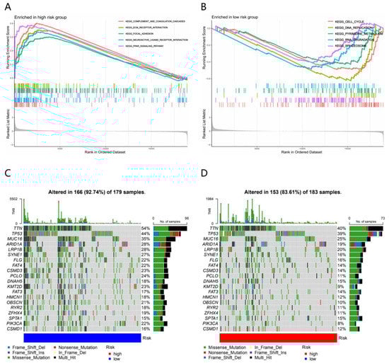 Gene mutations were then analyzed to gain further biological insight into the TME of different risk subgroups. We found that the mutation rate in the LR subgroup (altered in 166 (92.74%) of 179 samples) was significantly higher than that in the HR subgroup (altered in 153 (83.61%) of 183 samples). Missense mutation was the most common mutation type, followed by nonsense and frame shift deletions. Genes with the highest mutation frequency were TTN (54% in LR samples and 40% in HR samples), TP53 (44% in LR samples and 39% in HR samples), MUC16 (35% in LR samples and 25% in HR samples) and so on (Figure 3C,D).