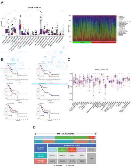 Next, to penetrate into the immune patterns of different risk subgroups, we marked 29 immune-related functions of each sample via ssGSEA. Thirteen of them showed differences between the HR and LR subgroups: CCR (p < 0.01), DCs (p < 0.01), iDCs (p < 0.01), Macrophages (p < 0,001), Mast cells (p < 0.001), Neutrophils (p < 0.001), T helper cells (p < 0.05), Type II IFN Response (p < 0.001) were active in the HR subgroup; however, Cytolytic activity (p < 0.05), Inflammation−promoting (p < 0.01), MHC class I (p < 0.001), Th1 cells (p < 0.05), Th2 cells (p < 0.001) were relatively silent in the LR subgroup (Figure 4C), which indicated that these immune-related functions were closely linked with the prognosis.