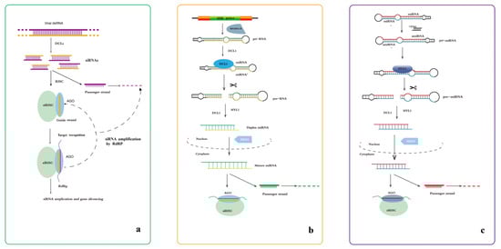 In RNA-containing plant viruses, the dsRNA structures of viral RNAs are processed by Dicer-like proteins into long (24–26 nt) and short (21–23 nt) siRNA fragments [17,18]. Double-stranded siRNAs are unwound into the sense (passenger) and antisense (guide) strands by the activated RISC. Subsequently, the passenger strand is degraded, whereas the guide strand is incorporated into the functional siRISC, which contains an argonaute (AGO) protein encompassing an sRNA domain (PAZ domain). Then, the guide strand targets a complementary mRNA transcript via a base-pairing interaction [19,20,21]. These viral RNA-cleavage products can be amplified by endogenous plant RNA-dependent RNA (RdRP) polymerases, which gradually inhibit viral protein biosynthesis and strengthens the silencing response (Figure 1a) [22].