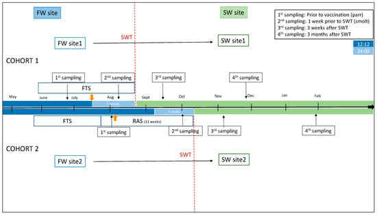 Two cohorts of Atlantic salmon reared in Southwestern Norway were examined (Figure 1). Fish material was provided by Mowi AS (Bergen, Norway), and fish used were from the Mowi strain. No specific disease traits were selected for, and the only trait selected for was growth. The sex ratio in the cohorts was close to unity. Random sampling of fish was performed, and sex was not taken into account. In cohort 1, fish were raised in a traditional flow-through (FT) production unit until transfer to the sea. Fish were fed a commercial freshwater feed (Skretting, Stavanger, Norway). The production unit had an average water temperature per month varying from 9.48 °C to 14.04 °C, the highest temperature measured during the month of March. A 12:12 L:D photoperiod regime was applied until the time of vaccination, followed by a 24:00 constant light regime for 5 weeks until seawater transfer (SWT). Fish were vaccinated intraperitonially (i.p.) with a commercial multivalent vaccine (AquaVac PD7, MSD AH) at a size of 50–70 g. SWT of fish with an average weight of 87.4 (+/−12.5) g took place at the end of August.