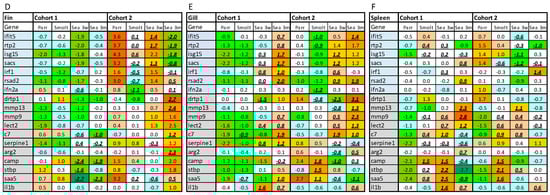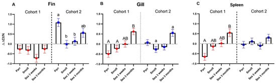 Temporal changes of gene expression in dorsal fin, gill, and spleen. Data are normalized within each cohort so that the mean of each gene in the entire data set is zero. (A–C): average expression of immune genes (mean ΔΔCt of all genes ± SE) in fin (A), gill (B), and spleen (C) (n = 9–12 individuals at each time-point). Bars within one cohort not sharing the same letters are significantly different (ANOVA, Tukey test, p < 0.05). The dotted lines separate cohorts. (D–F): Heatmaps present ΔΔCt for selected genes of innate antiviral immunity (VRG) and markers of acute inflammation and stress (AIS) in fin (D), gill (E), and spleen (F): VRG: ifit5 (interferon-induced protein with tetratricopeptide repeats 5), rtp2 (receptor-transporting protein 2), isg15 (interferon-stimulating gene 15), sacs (sacsin), irf1 (interferon regulatory factor 1), rsad2 (radical S-adenosyl methionine domain-containing protein 2, viperin) and ifn2a (interferon 2a). AIS: drtp1 (differentially regulated trout protein 1), mmp13 and 9 (matrix metalloproteinases), lect2 (leukocyte cell-derived chemotaxin 2), c7 (complement component c7), serpine1 (plasminogen activator inhibitor 1), arg2 (arginase-2), camp (cathelicidin), stbp (saxitoxin and tetrodotoxin-binding protein 2-like), saa5 (serum amyloid a-5) and il1b (interleukin-1 beta). Expression differences from the first time-point, parr (ΔΔCt > |0.8|, p < 0.05), are highlighted with underlined bold italics.