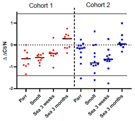 Comparison of immune gene expression in the gill with the gill reference data set (GRDS) [] by ΔΔCt found deviation greater than 2σ (2SD) in only three out of 85 analyzed fish, all in cohort 2 and in parr, smolt, and grower after 3 weeks in the sea (Figure 3). The deviations from GRDS were normally distributed (Kolmogorov–Smirnov test).