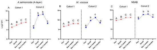Multiplex immunoassays. Levels of circulating specific antibodies against A-layer of A. salmonicida (A) and M. viscosa whole-cell sonicate (B), and nonspecific antibodies (NSAB) (C). Data are displayed as mean log2MFI (median fluorescent intensity) + SEM (n = 12–15 individuals at each time-point). Data points within one cohort not sharing the same letters are significantly different (ANOVA, LSD test, p < 0.05).