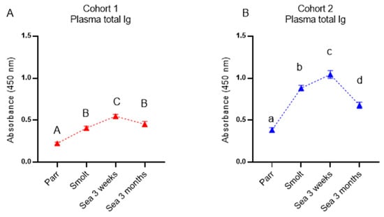Total immunoglobulin (Ig) in plasma from Atlantic salmon from cohort 1 (A) and cohort 2 (B). Samples are analyzed by ELISA and at an absorbance of 450 nm. Data are presented as mean with SEM (n = 12–15 individuals at each time-point). Data points within one cohort not sharing the same letters are significantly different (ANOVA, LSD test, p < 0.05).