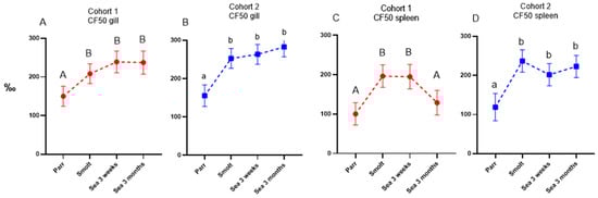 Sequencing of IgM variable region (Ig-seq). Cumulative frequencies (‰) of fifty largest clonotypes (CF50) in gill (A,B) and spleen (C,D). Data are presented as mean + SEM (n = 6–7). Data points within one cohort not sharing the same letters are significantly different (ANOVA, LSD test, p < 0.05).