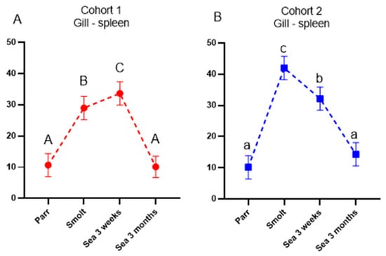 Unique immunoglobulin sequences or clonotypes mark B cells of clonal origin. The co-occurrence of identical clonotypes in the spleen and gill reflects the migration of B cells from the lymphoid (spleen) to the peripheral organ (gill). In Atlantic salmon, sharing of clonotypes between organs is relatively low under basal conditions but increases after strong immunization, followed by a gradual decrease because the largest clonotypes in the lymphoid organ are substituted with recently expanded clones. Recruitment of B cells to gills was markedly stimulated in smolts of both cohorts (Figure 7A,B), as illustrated by an increase in the number of clonotypes in the gill that were also detected in the spleen. In cohort 2, sharing steadily decreased afterward toward the end of the sampling period, while reduction was preceded with a peak after 3 weeks in the sea in cohort 1. At the last sampling time-point (3 months post-SWT), this parameter returned to the initial levels in both cohorts.