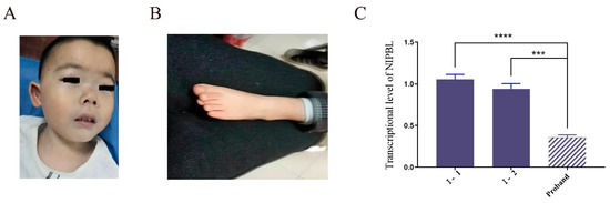 Clinical features. (A) The patient had well-defined and arched eyebrows with synophrys; narrow palpebral fissures; long and curly eyelashes; broad nose with high nasal bridge; and broad mouth. (B) The short left fifth toe was observed in the boy. (C) Quantitative analysis of NIPBL expression in patient and his parents. *** p ≤ 0.001, **** p ≤ 0.0001.