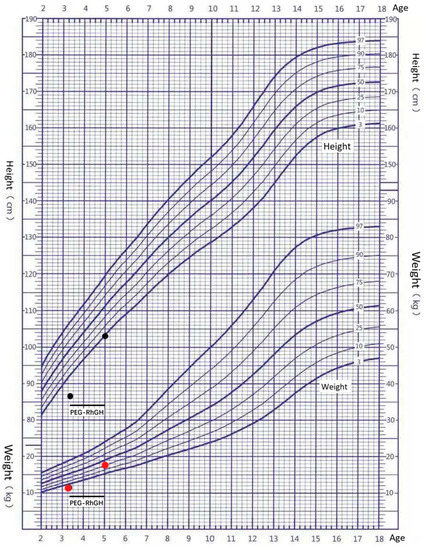 Growth curve of boys aged 2–18 years in China. The black dots represent changes in height after (PEG-rhGH) treatment. The red dots represent changes in weight after (PEG-rhGH) treatment.