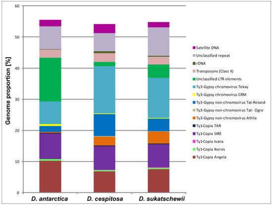 Most eukaryotic genomes contain large numbers of repetitive DNA sequences [43,44]. Transposable elements (TEs) as well as tandem repeats (satellite DNA) are highly abundant and diverse parts of genomes [45,46]. In plants, TEs can constitute up to 90% of their genomes [47,48,49]. Due to the fact that TEs are capable of changing their location and/or copy numbers, they can influence the genome organization and evolution [50,51]. Currently, TEs are separated into two major classes, class I (retrotransposons, including LTR retrotransposons) and class II (DNA transposons), based on TEs structural characteristics and mode of replication [50,52]. In plant genomes, LTR retrotransposons include the Ty1-Copia and Ty3-Gypsy superfamilies, which are further divided into a number of families mostly specific to a single or a group of closely related species [53]. In plant genomes, LTR retrotransposons are highly abundant, making up to 75% of nuclear DNA [54,55]. In our study, a comparative repeatome analysis of D. sukatschewii, D. cespitosa, and D. antarctica also showed that LTR retrotransposons made up the majority of their genomes. LTR retrotransposons are considered to be main contributors to the variations of nuclear genomes within angiosperms [33,56,57,58,59]. These retroelements are able to replicate using the copy and paste mechanism and, thus, generate new copies of the elements and increase the size of the genome [45]. However, the LTR copies can also be efficiently eliminated from the genome, through both solo LTR formation and accumulation of deletions, which reduces the genome size [54]. Genome size is often treated as an intrinsic property of a species, and intra- and interspecific variations in genome size might reflect different evolutionary processes during speciation [60].
