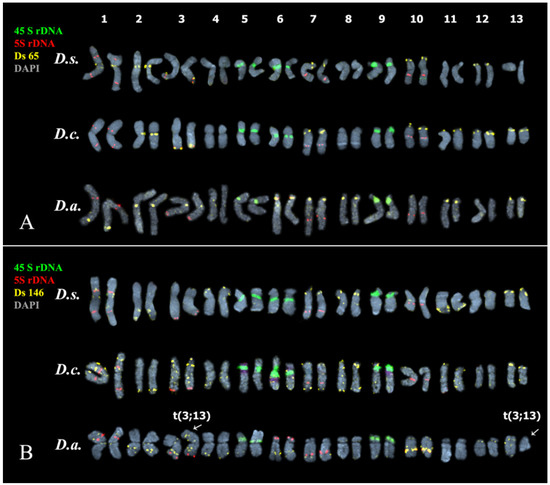 Karyotypes of the studied Deschampsia species. Karyograms of D. sukatschewii (D.s.), D. cespitosa (D.c.) and D. antarctica (D.a.) after multicolor FISH with (A) 45S rDNA (green), 5S rDNA (red) and Ds 65 (yellow) (the same metaphase plates as in Figure 3B,E,H); and (B) 45S rDNA (green), 5S rDNA (red) and Ds 146 (yellow) (the same metaphase plates as in Figure 3C,F,I). Chromosome DAPI-staining—grey. Arrows point to chromosomal rearrangements.