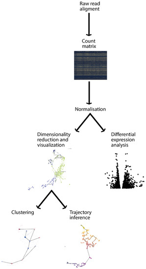 At its core, transcriptomic data analyses operate on the number of detected transcripts as a quantitative measure of gene expression. Historically, microarrays and RNA-seq have provided gene expression information for a group of cells. More recently, single-cell technologies allow us to measure transcript expression on a single-cell resolution [13,14]. The raw data of both bulk and single-cell technologies require several analytical steps, recapitulated in Figure 2 and described in the following sections.