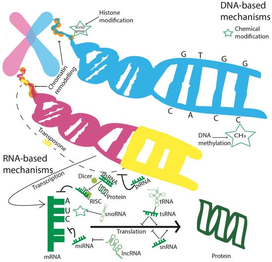 Epigenetic modifications occur on different biological scales. DNA-based mechanisms are concerned with histone modifications, consisting of chemical modifications (i.e., acetylation), DNA methylation, chromatin remodelling, and transposons. RNA-based mechanisms are multiple, complex, and still only partially known: miRNA and the RISC complex can induce mRNA degradation; lncRNAs silence the activity of miRNA, while snRNA and tsRNA can both silence, but also induce, mRNA translation to protein. piRNAs can interact with DNA, interfering with the genetic movements of transposons; snoRNAs induce chemical modifications at the mRNA level.