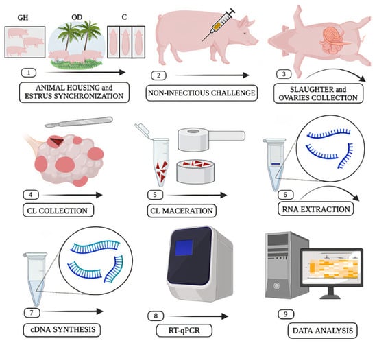 To determine the effect of LPS on porcine corpora lutea and the environment’s role in coping with this challenge, we used the same animals described in our previous study [14]. Briefly, forty-two gilts from commercial crossbreed lineages participated in the experimental design of this study (Figure 1). All females received water ad libitum and the same commercial nutrition, even females housed in groups because they had individual feeding stalls. In addition, all of them were identified as sexually mature using a boar before the experiment (all of them presented at least one clinical sign of estrus). The animals had their estrous cycle synchronized with Altrenogest (Regumate®, MSD Saúde Animal, São Paulo, Brazil) at a dose of 20 mg per animal for 18 days, as recommended by the supplier. Then, the 42 gilts were separated into three groups of 14 animals each: crates (C), indoor group pens (GH), and outside group housing (OD). To enter one of the three housing possibilities, the gilts had their body weight and degree of kinship assessed. Our objective was to keep the group heterogeneous in terms of genetic background and with similar average body scores across all housing groups. The animals were kept throughout the estrous cycle in the specific housing system they were housed. Then, on the day of estrus, six gilts from each housing system received a single dose of 2 µg/kg of LPS (E. coli O111:B4, Sigma Aldrich, St. Louis, Missouri, USA) while the other eight received SAL as a control. On the 5th day (~120 h) after the estrus day, all the gilts were slaughtered, and each gilt’s right and left ovaries were collected. Subsequently, the ovaries were immediately frozen in liquid nitrogen and stored at −80 °C.