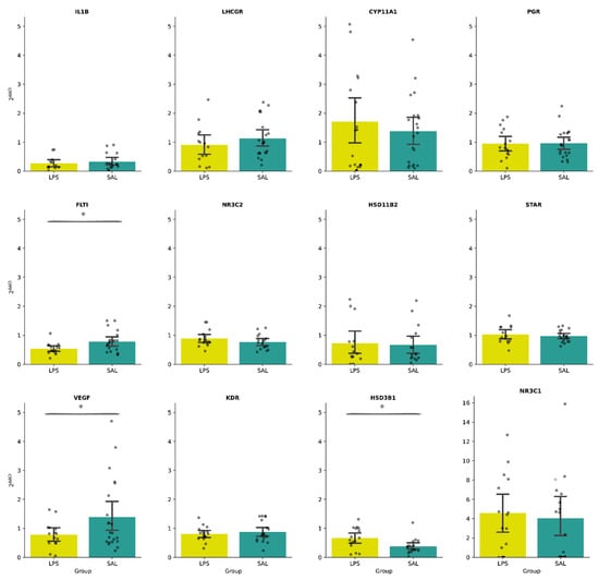 Interestingly, when comparing the animals that received LPS and those that received saline solution (SAL), differences were identified for three genes. For the FLT1 and VEGF genes, animals challenged with LPS experienced significant downregulation of gene expression in relation to the group exposed to SAL (Figure 2; Supplementary Table S2). For the HSD3B1 gene, animals challenged with LPS experienced significant upregulation of gene expression compared to the group that received SAL (Figure 2; Supplementary Table S2).