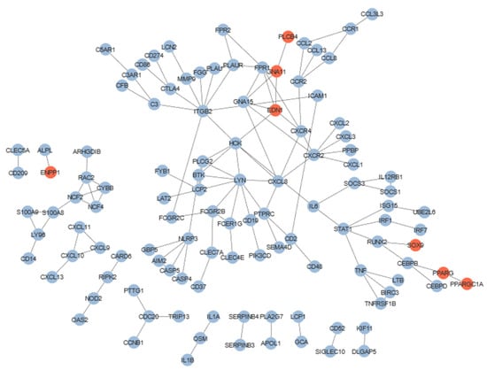Protein–protein interaction (PPi) networks were incorporated to elucidate the complex interactions taking place in the response to anti-TNFα therapy in the diseases under study, as well as to characterize specific patterns of the deregulated genes. DEGs of the combined meta-analysis derived a PPi network consisting of more than 400 nodes with a PPi enrichment p < 10−16. Out of those, 114 genes were noticed to be interconnected inside our network (Figure 4). Three shared down-regulated genes were found inside the sub-networks of our PPi; GNA15, CEBPD and TRIP13. TRIP13 interacts with CDC20 with a score of 0.961, both participating in the spindle assembly checkpoint. Furthermore, CEBPD and GNA15 were identified inside our largest sub-network, as derived from our PPi analysis. CEBPD is a transcription factor that forms a heterodimer with CEBPB (PPi score = 0.991), which further regulates the transcription of IL-6, a key proinflammatory cytokine overexpressed in multiple autoimmune diseases. On the other hand, GNA15 is involved in G-protein signaling events, as seen through our enrichment analyses (Supplementary Table S2), which is further explained through its interactions with various proteins including chemotactic factors (FPR1, CXCL8) and the preproendothelin-1 (EDN1), with an interaction score >0.9 in all cases.