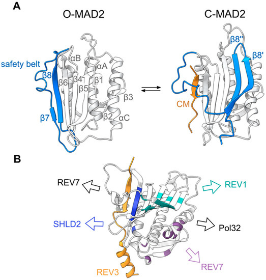 The HORMA domain was first identified and named on the basis of a primary sequence similarity between yeast Hop1, Rev7, and Mad2 []. Mad2 is a key component of the spindle assembly checkpoint that regulates chromosome segregation during mitosis and meiosis [], while Rev7 is a multifunctional protein involved in different DNA repair pathways, including the translesion synthesis and shielding complexes []. Mad2 and Rev7 are short proteins, consisting exclusively of their HORMA domains, which can be further divided into the following two distinct domains: a core consisting of three central α-helices (αA-C) and a three-stranded β-sheet (β4-6), and a flexible C-terminal domain called the safety belt (Figure 1). In solution, recombinant monomeric Mad2 preferentially adopts an open Mad2 (O-Mad2) conformation, where β8 of the safety belt domain interacts with β6 [,]. The addition of a short peptide motif, termed closure motif (CM), from one of its binding partners leads to a significant conformational rearrangement, promoting the safety belt (β8′ and β8″) to interact with β5 on the opposite side of the protein. This results in a closed Mad2 (C-Mad2) conformation, in which the CM is topologically entrapped by the safety belt []. This rearrangement has been subsequently identified in Rev7 and Hop1, and is believed to be a common property of all HORMA domain-containing proteins [,,].