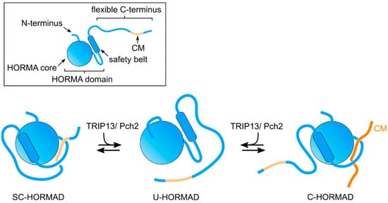A conserved feature of the C-terminal region of meiotic HORMADs is the presence of CMs that promote the formation of HORMAD oligomers on chromosome axes [,]. These CMs are also proposed to induce the formation of a self-closed conformation (SC-HORMAD), in which the HORMA domain binds the CM on its own C-terminus [,] (Figure 2 and Figure 3). We note that, although interactions between the HORMA domain and their internal CMs have been identified, currently there is no direct evidence showing that this occurs via the safety belt-CM mechanism in cis (i.e., structure of a full length HORMAD binding its internal CM). Similarly, structural evidence for meiotic HORMADs displaying a stable open conformation, as observed for Mad2, is currently lacking. However, the HORMA domain of Hop1 adopts two distinct monomeric conformations in solution: one consistent with a closed conformation and a second in which the safety belt is disengaged from the HORMA domain []. This conformation, referred to as unbuckled, is thought to represent an intermediate that allows the binding of the safety belt to a CM. Below, we summarize the studies that are starting to elucidate how meiotic HORMADs and their interactors control different chromosomal events of meiosis.