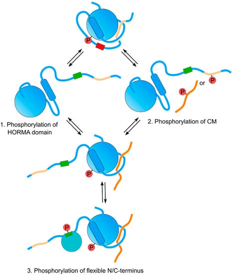 Phosphorylation events on Mad2 are known to regulate its conformational transition and to control its affinity for different ligands []. Similarly, recent studies show that phosphorylation events on meiotic HORMADs, and on the CMs that they bind, also regulate the function of these proteins. Phosphorylation of an [S/T]Q cluster on the C-terminus of yeast Hop1 by Mec1/Tel1 (ATM/ATR) promotes the recruitment and activation of the Mek1 kinase to axial elements, ensuring inter-homologue recombination and checkpoint activation []. The PP4 phosphatase also interacts with Hop1 and is proposed to promote the initial steps of Hop1 loading to axial elements []. In C. elegans, phosphorylation on the short N-terminal region preceding the HORMA domain of HTP-1 and HTP-2 promotes the recruitment of LAB-1 to axial elements to regulate sister chromatid cohesion release []; phosphorylation of S325 by MPK-1 on the C-terminus of HTP-1 regulates SC assembly and/or stability []; and phosphorylation of HIM-3 on the CM at its C-terminus regulates the binding of HTP-2 and SC disassembly []. In Arabidopsis, CDKA;1-dependent phosphorylation of residues within the HORMA domain promotes ASY1 loading to axial elements by increasing its binding affinity to ASY3 []. In addition to the above functional studies, phospho-specific antibodies, raised against S375 in a [S/T]Q motif of mouse HORMAD1, confirm in vivo phosphorylation of this residue []. Interestingly, HORMAD1 phosphorylation is detected in the absence of SPO11 activity, suggesting that HORMAD1 is phosphorylated in a DNA damage-independent manner []. Thus, phosphorylation events regulate meiotic HORMADs in at least three of the following ways: (1) by regulating the affinity of the HORMA domain for CMs; (2) by modifying the affinity of CMs for the HORMA domain; and (3) by regulating their ability to recruit interactors to their N- and C-terminal regions flanking the HORMA domain (Figure 5). Given the central role that kinases play in HORMAD-controlled events, including recombination and synapsis, it is likely that the examples discussed above constitute a small subset of the phosphorylation events that govern meiotic HORMADs functions.