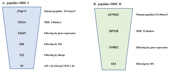 Results overview for the neoantigen discovery: (A). MHC class I binding neoantigens (8–11-mer) (B). MHC class II binding neoantigens (15–30-mer).
