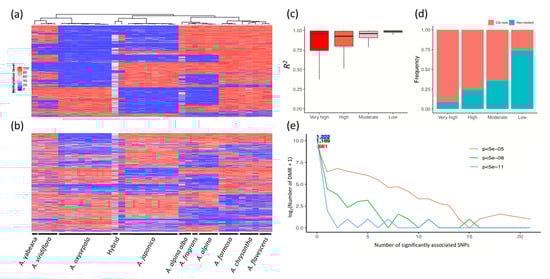Since both genetic variation and differential CG methylation seemed to have crucial and multifaceted influences on the adaptation of the ten Aquilegia species, we wondered whether differential epigenetic modifications were dependent on genetic variation. Among the 588,659 CG loci examined, 224,222 (38.09%) carried a CG-loss variation. We then examined the epigenetic variation for the variant and non-variant CG loci. As shown in Figure 5, genetic-epigenetic associations of varying magnitude were observed in both types of CG loci. The variation-carrying CG loci conveyed information that highly resembled their genetic background. The overall methylation pattern was highly conserved within the same species, but exhibited obvious divergence across the ten Aquilegia species (Figure 5a). In contrast, CG methylation divergence at the non-variant CG loci showed higher variability at both the intra- and inter-specific levels (Figure 5b). By examining the correlation of the genetic variability and cytosine methylation, we found that CG methylation divergence at the variation-carrying CG site was largely attributable to the CG-loss variations (Figure 5c). In particular, 75% of the CG-loss variations that occurred at the most highly variable CG-methylated dinucleotides could explain at least 75% of the total epigenetic variability per se. Nevertheless, there was still a considerable proportion of epigenetic variability that could not be sufficiently explained by the variant-CG loci (Figure 5d).