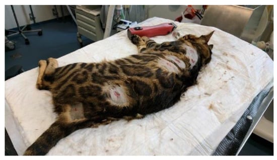 Case no. 1 was a 1-year-old purebred Bengal cat with a history of multiple repetitive skin lesions after minimal trauma occurring since the age of 6 months. At the time of presentation, a scarring alopecic lesion of about 5 × 5 cm was visible on the dorsal neck, which resulted from a previous trauma. Furthermore, the skin was diffusely thinner and much more elastic compared to the skin of a healthy young Bengal cat. In addition, the patient presented with multiple small skin tears distributed over the entire trunk/back area (Figure 1). The cat had no pruritus and there were no signs of active inflammation. Skin cytology, skin scrapings, and the trichogram were unremarkable.