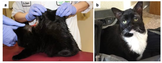Clinical images of the EDS-affected cats no. 2 and 3. (a) Severe hyperextensibility of the dorsal skin. The skin extensibility index was 19% []. Note an extensive laceration on the back. (b) Excessive skin tissue is visible on the face of case no. 3.