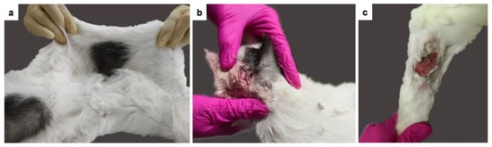 Clinical images of the EDS-affected cat no. 4. (a) The abnormal extensibility of the dorsal skin is clearly visible. The skin extensibility index was 22%. (b,c) Lacerations of the skin on the head and the leg.