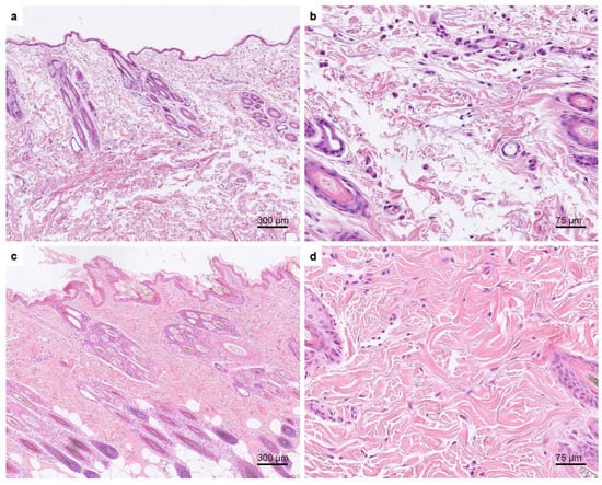 Hematoxylin and eosin-stained skin biopsies of case no. 4 and an age-matched control. (a,b) Histopathological changes seen in the affected cat. The epidermis appears thinner than in the skin biopsies of the age-matched control cat (c,d). (a) The dermal collagen fibers are haphazardly arranged, shortened, and sometimes curled. They were uneven in length and width. Many fibers are very wispy and the interfibrillar spaces are widened. (b) Higher magnification of the dermal changes seen in the affected cat. (c) Normal skin of an age-matched control cat. The dermal collagen fibers are much thicker and longer and the interfibrillar spaces are smaller than in the affected cat. (d) Higher magnification of normal skin.