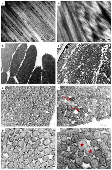 TEM analysis of case no. 4 skin connective tissue revealed abnormalities in the collagen fibril organization and structure. Abnormal findings from the reticular part of the dermis were loosely packed and disorganized collagen fibers (Figure 5b,d). Individual collagen fibers contained curled fibrils (Figure 5b,d). Higher magnifications showed cross-sections of collagen fibrils with different diameters and irregularly outlined fibrils within a fiber (Figure 5f,h). In contrast, the connective tissue of an age-matched control cat contained densely packed collagen fibers with parallel-aligned fibril organization (Figure 5a,c). Cross-sections of fibrils showed uniform diameters and regularly shaped, almost round outlines (Figure 5e,g).