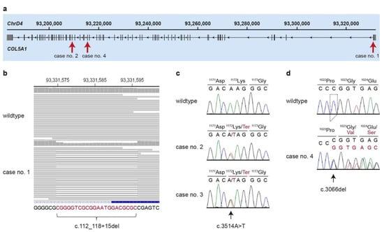 In case no. 2, we identified another single candidate variant, a heterozygous nonsense variant in COL5A1, predicted to truncate 36% of the coding sequence (Table 2). We confirmed identical heterozygous genotypes in cases no. 2 and 3 by Sanger sequencing (Figure 6a,c).