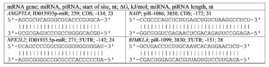 The characteristics of miRNA, piRNA, and mRNA (ANGPTL4, NFE2L2, NAIP, and RIMKLA) interactions with ΔG/ΔGm equal 100%.